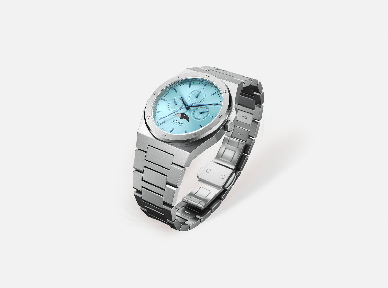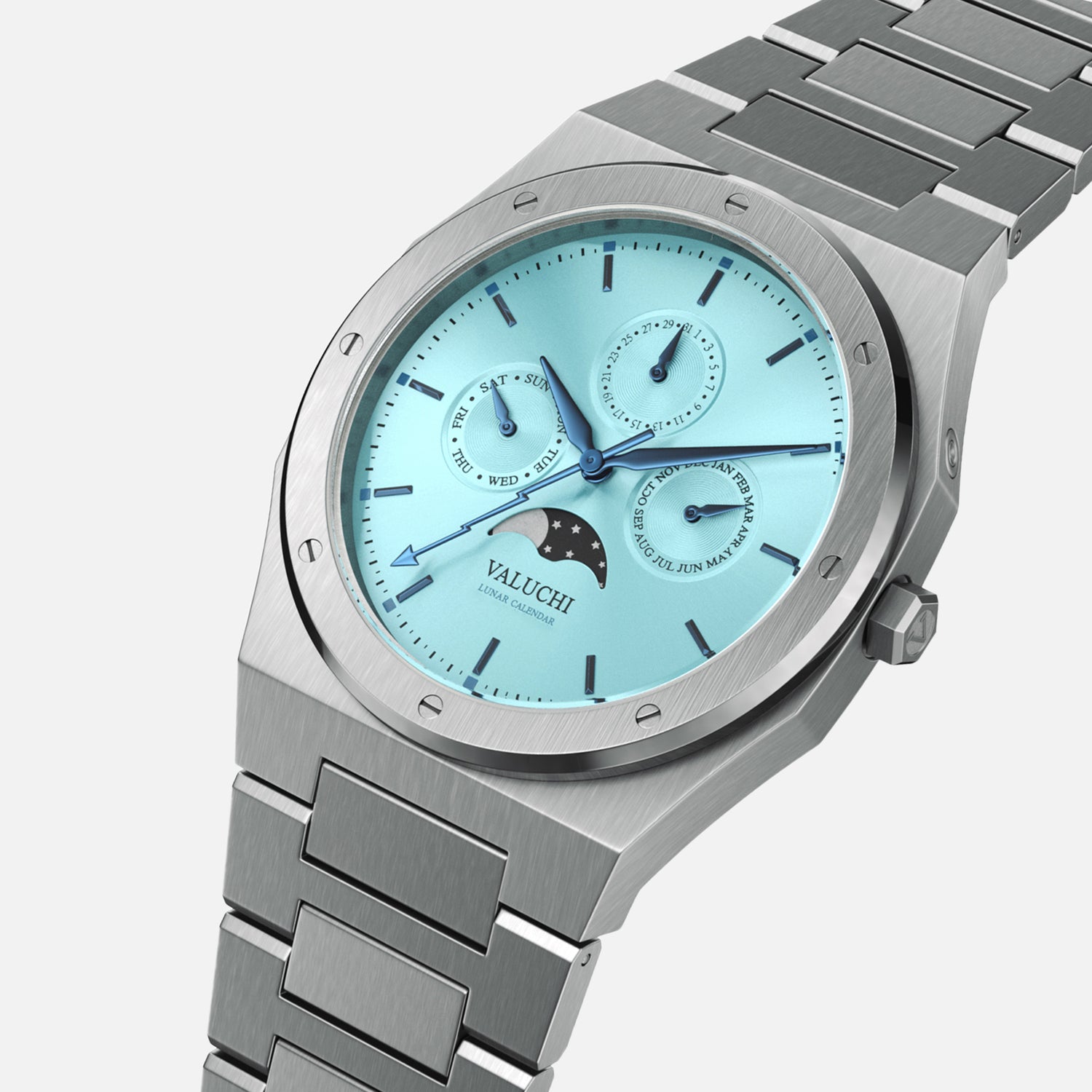The eight-screwed bezel set the tone for the Lunar Calendar watch style, highlighting its distinctive design with a moonphase and calendar functionality.