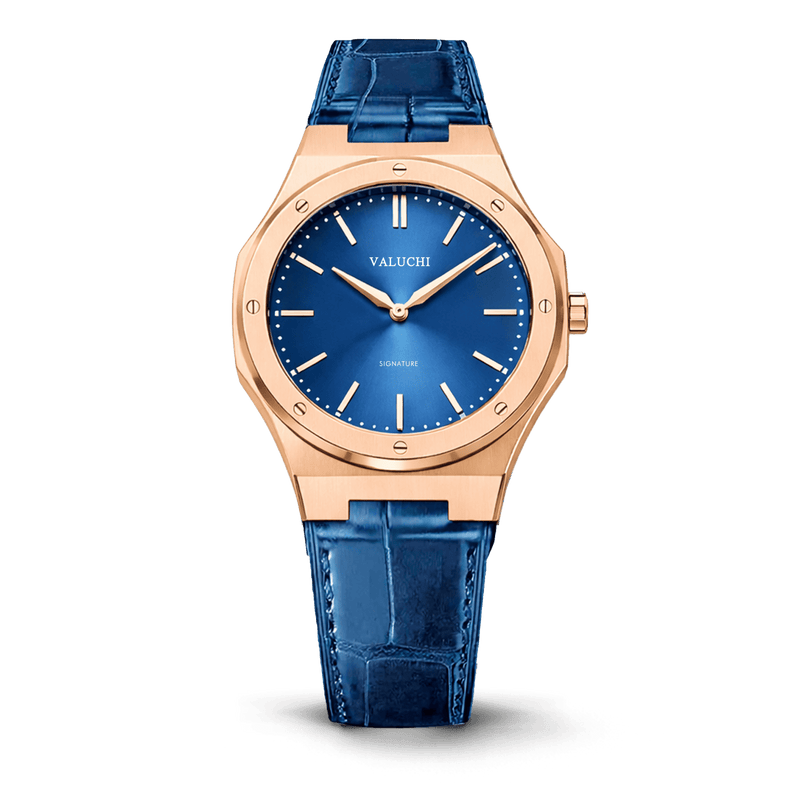 Das luxuriöse Gehäuse aus Roségold verleiht der Uhr einen Hauch von Raffinesse. Das elegante Gehäuse steht in starkem Kontrast zum blauen Zifferblatt und sorgt für ein auffälliges Design. Ganz gleich, ob Sie an einer formellen Veranstaltung teilnehmen oder leger auftreten, das Gehäuse aus Roségold wertet jeden Look auf.
