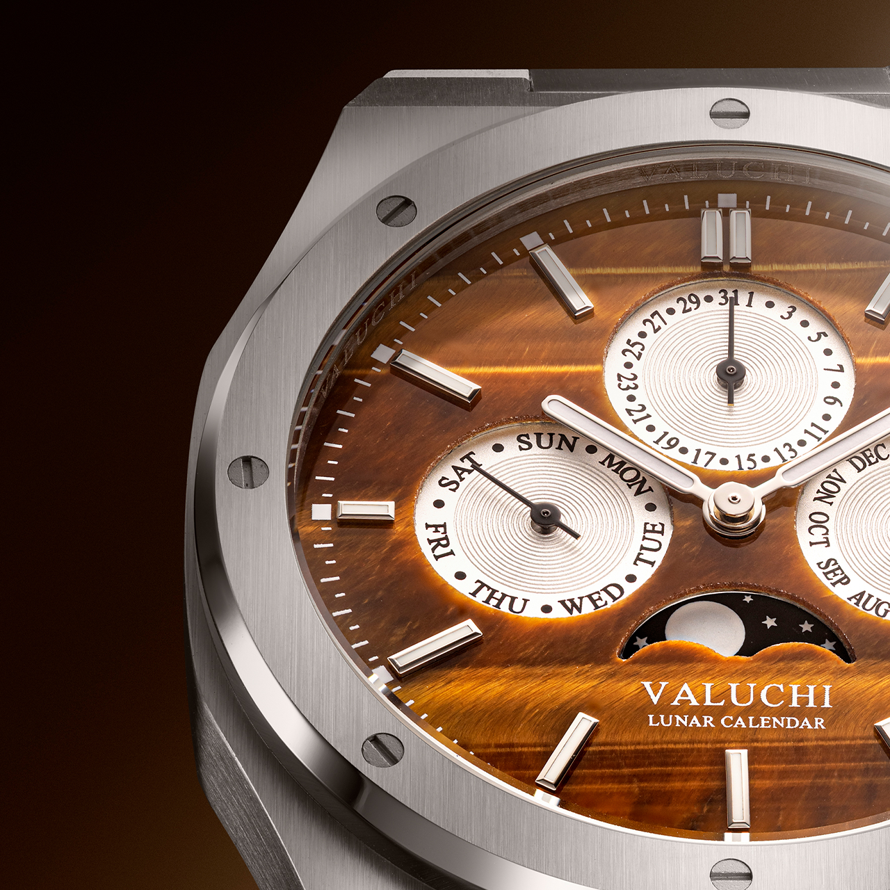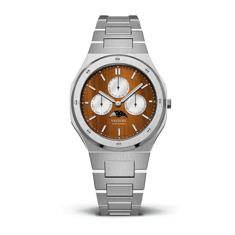 Each dial is cut from real Tiger Eye stone, giving every watch a unique pattern and a powerful, warm glow. Paired with a brushed stainless-steel bracelet and housed in our exclusive Tiger Eye Collector’s Box — this is luxury redefined.