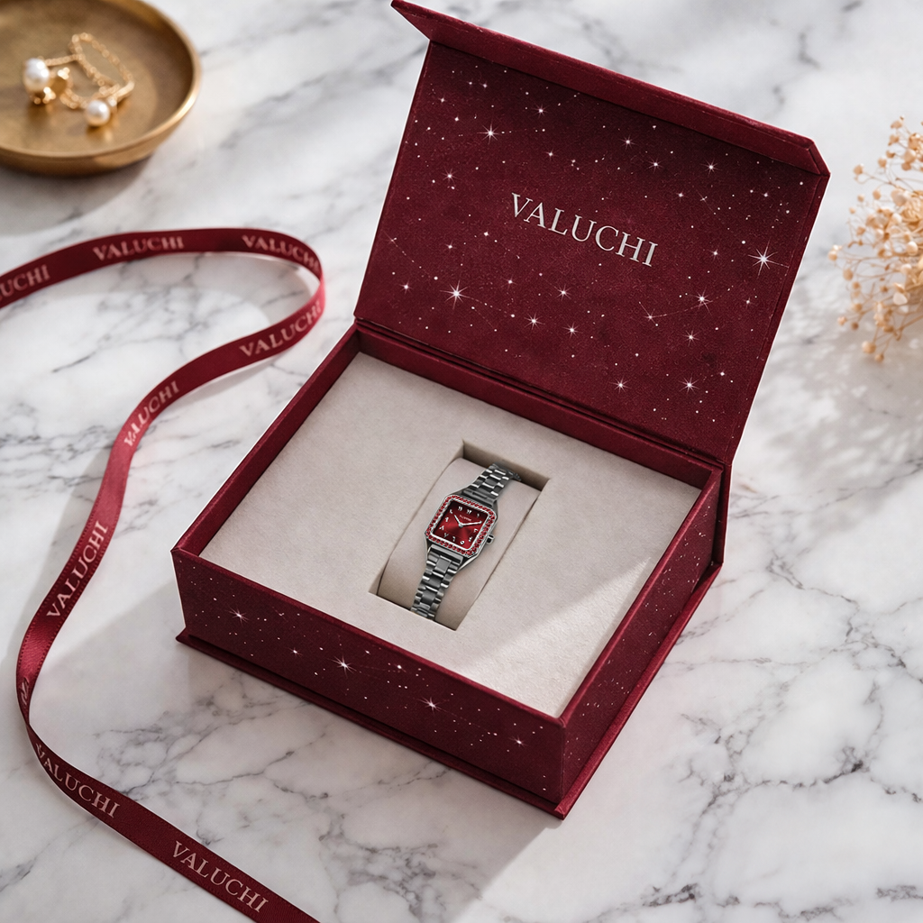 Encased in a deep burgundy presentation box, every detail is designed to elevate the experience — from the first glance to the final reveal. Because true luxury isn’t just seen, it’s felt.
