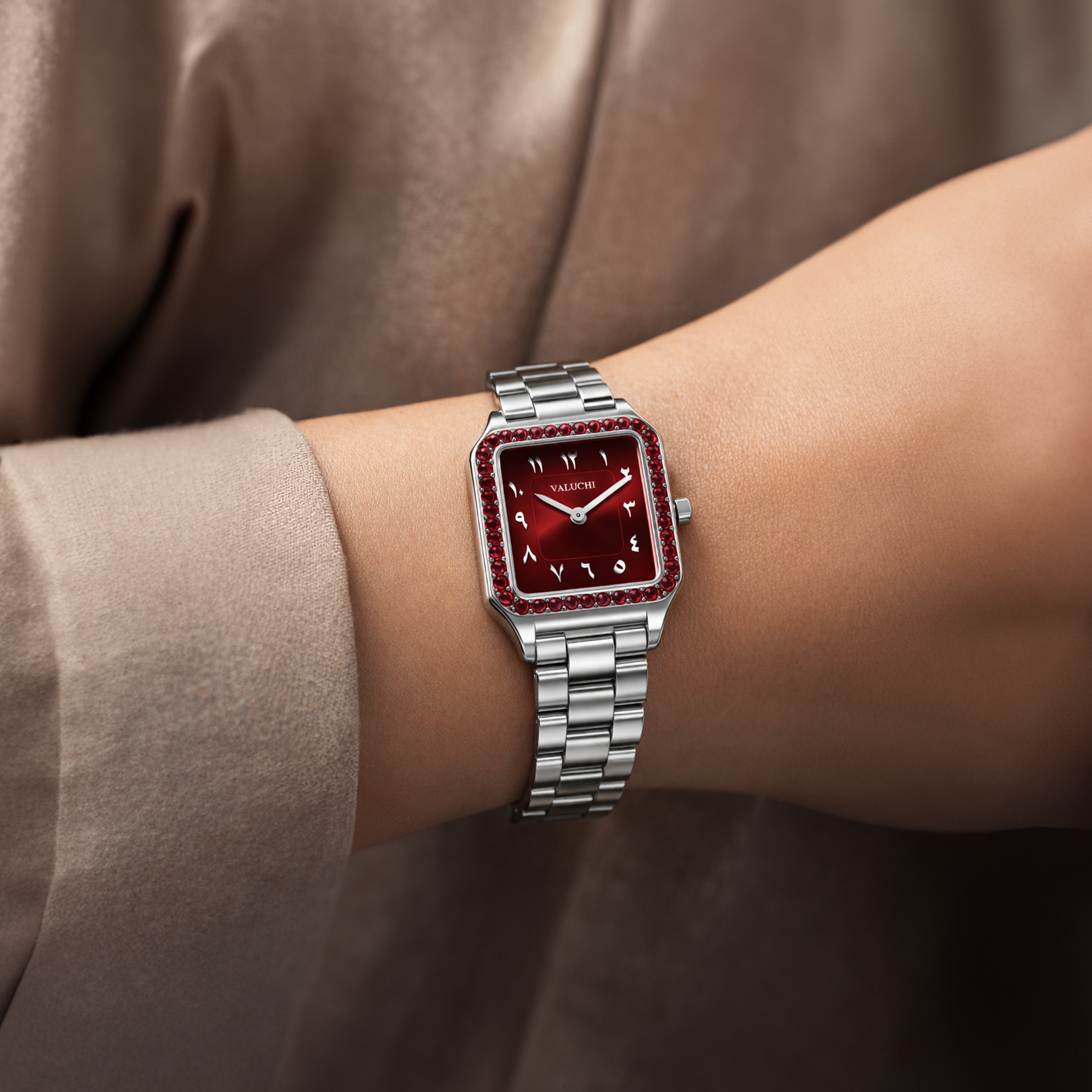 Finished with Arabic numerals — a subtle tribute to heritage — and crafted in a refined square silhouette made to stand out.
