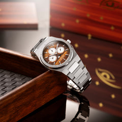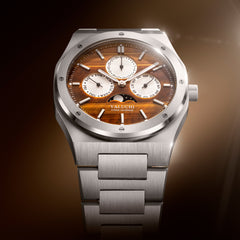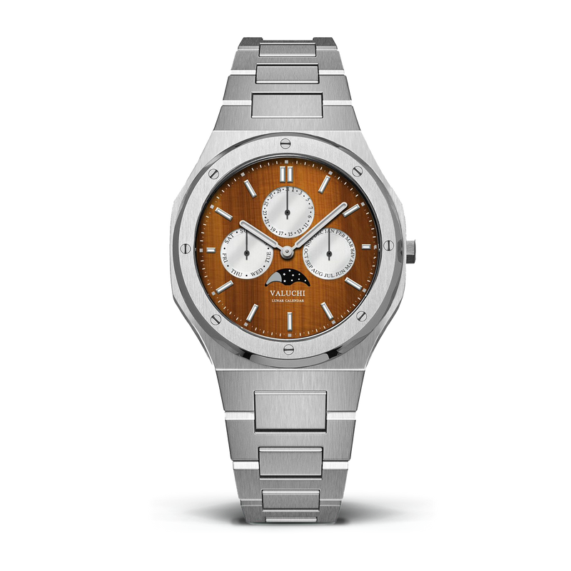 Each dial is cut from real Tiger Eye stone, giving every watch a unique pattern and a powerful, warm glow. Paired with a brushed stainless-steel bracelet and housed in our exclusive Tiger Eye Collector’s Box — this is luxury redefined.