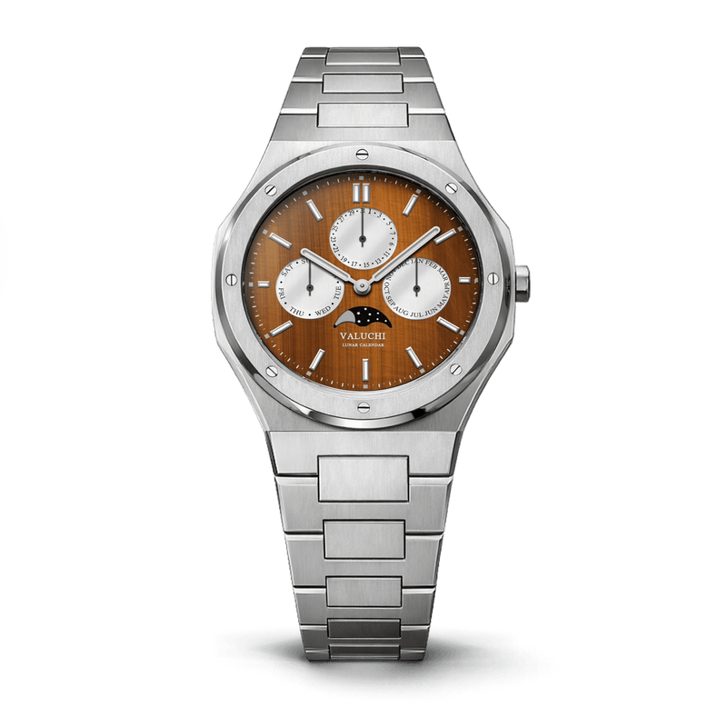 Each dial is cut from real Tiger Eye stone, giving every watch a unique pattern and a powerful, warm glow. Paired with a brushed stainless-steel bracelet and housed in our exclusive Tiger Eye Collector’s Box — this is luxury redefined.
