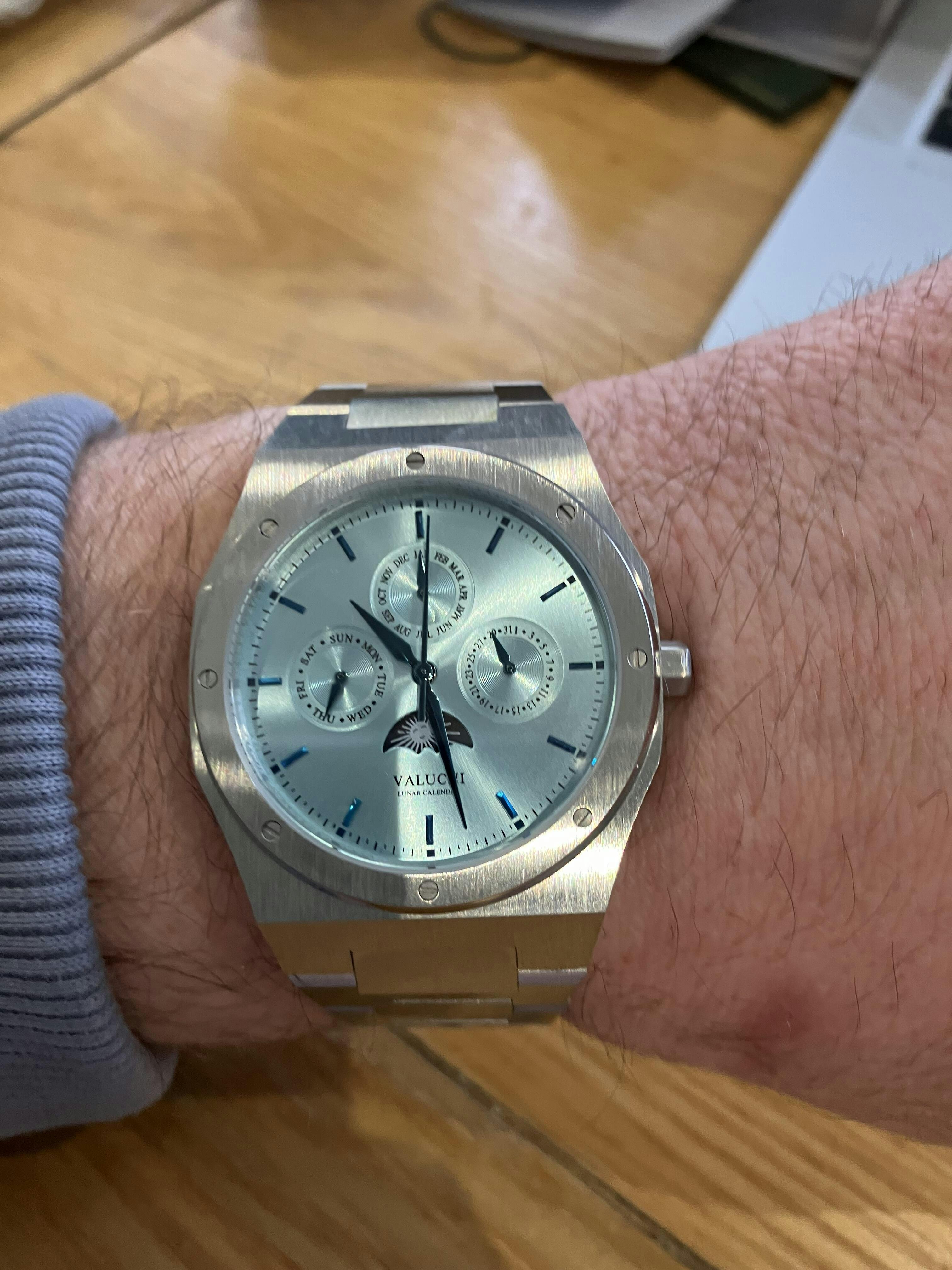 Made with high-quality materials, the Lunar Calendar watch is built to last. The stainless steel case and scratch-resistant sapphire crystal ensure that this watch can withstand daily wear and tear. With water resistance up to 50 meters, you can even take this watch for a swim without worrying about damage. Add this durable timepiece to your collection today.